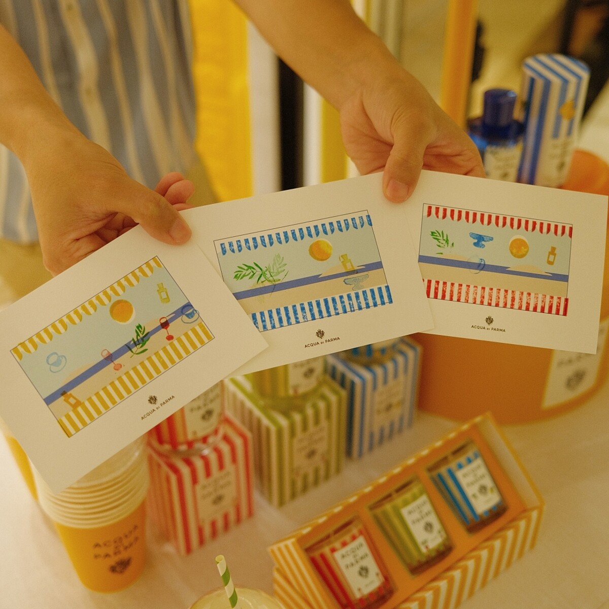 為歡慶夏日新品上市,Acqua di Parma推出夏日限定的消費者活動,包含特地從義大利空運來台、以Acqua di Parma夏日露臺限量版為靈感的「手印香氛明信片活動」 ,可選擇自己喜歡的條紋及圖案逐步蓋上,最後再挑選自己喜歡的香氛噴上,DIY 打造專屬於自己的夏日香氛明信片(凡臨櫃試香皆可免費獲得)。