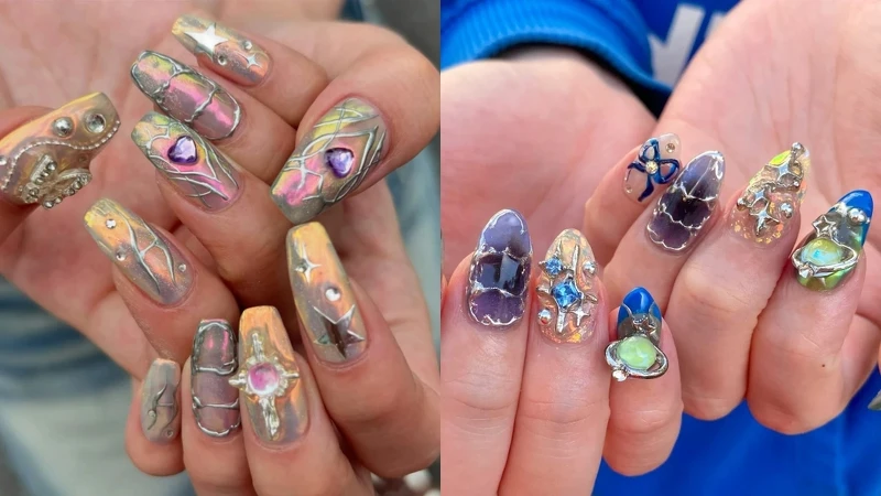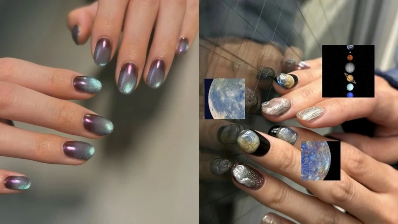 有大量賽博龐克的風格呈現,像是霓虹、金屬或冷冽的科技風格等,帶有濃濃的超現實科幻感,在Year 3000的年代,太空旅行可能也已經成為常態,因此宇宙的元素搭配金屬造型也是Y3K美甲設計的一環。
