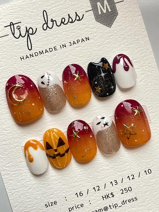 把南瓜畫成骷顱造型,或以南瓜橘爲主調,搭配幽靈、蝙蝠、木乃伊、鬼屋等萬聖節元素,為指尖增添滿滿的節日氣氛。