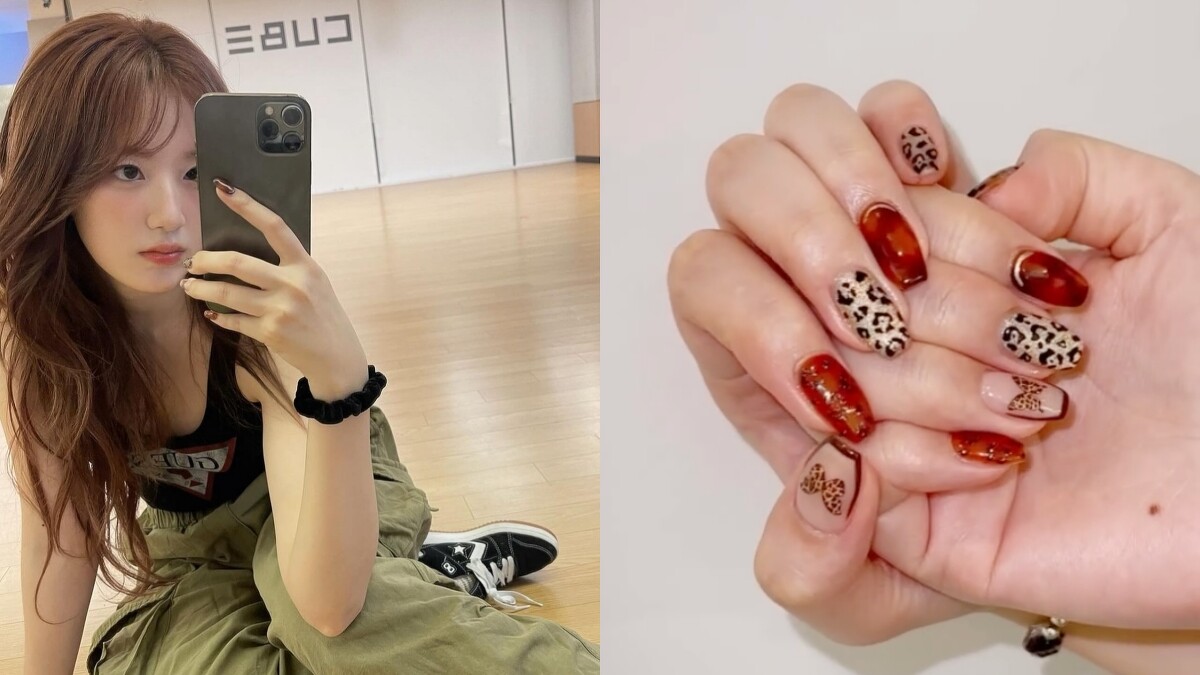 以紅棕色調為主色,在不同手指上畫上豹紋圖案,其中還有兩指是豹紋蝴蝶結圖案,狂野中不失甜美。