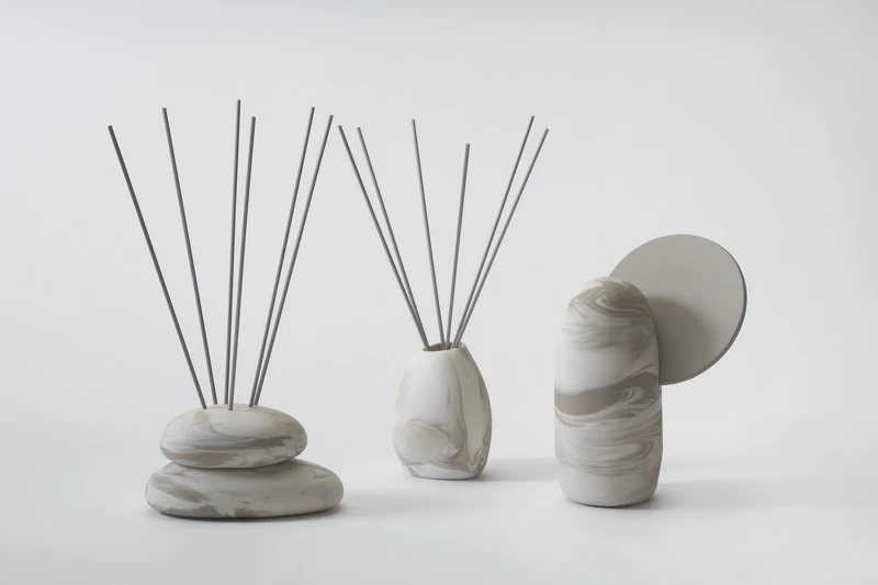 陶瓷擴香瓶由美濃燒窯元芳泉窯製作,造型靈感來自溪流中的卵石。圓潤比例與自然紋理使器物能長時間留在空間中,成為日常環境的一部分。