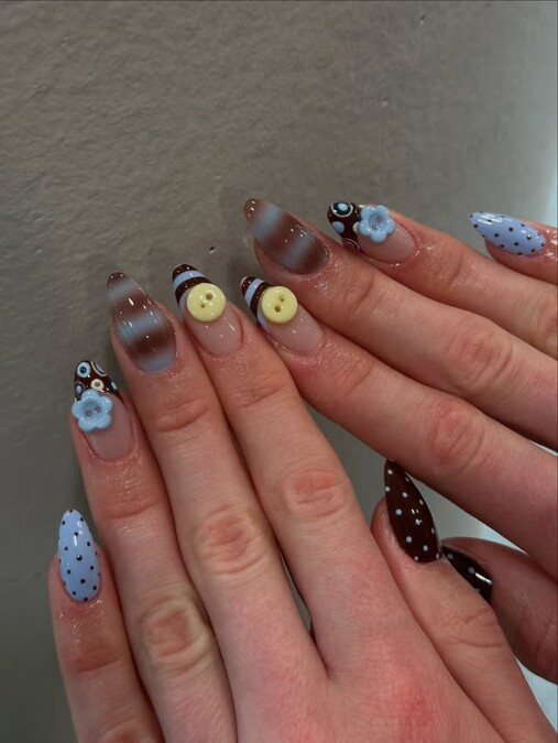 以水藍色與巧克力咖啡色為主色,加入立體花朵、圓點與可愛鈕扣元素,整體像是甜點或餅乾般的俏皮設計。霧面漸層與圖案混搭讓每一指都有不同亮點,是一款充滿童趣與個性的創意美甲,特別適合喜歡活潑風格的人。