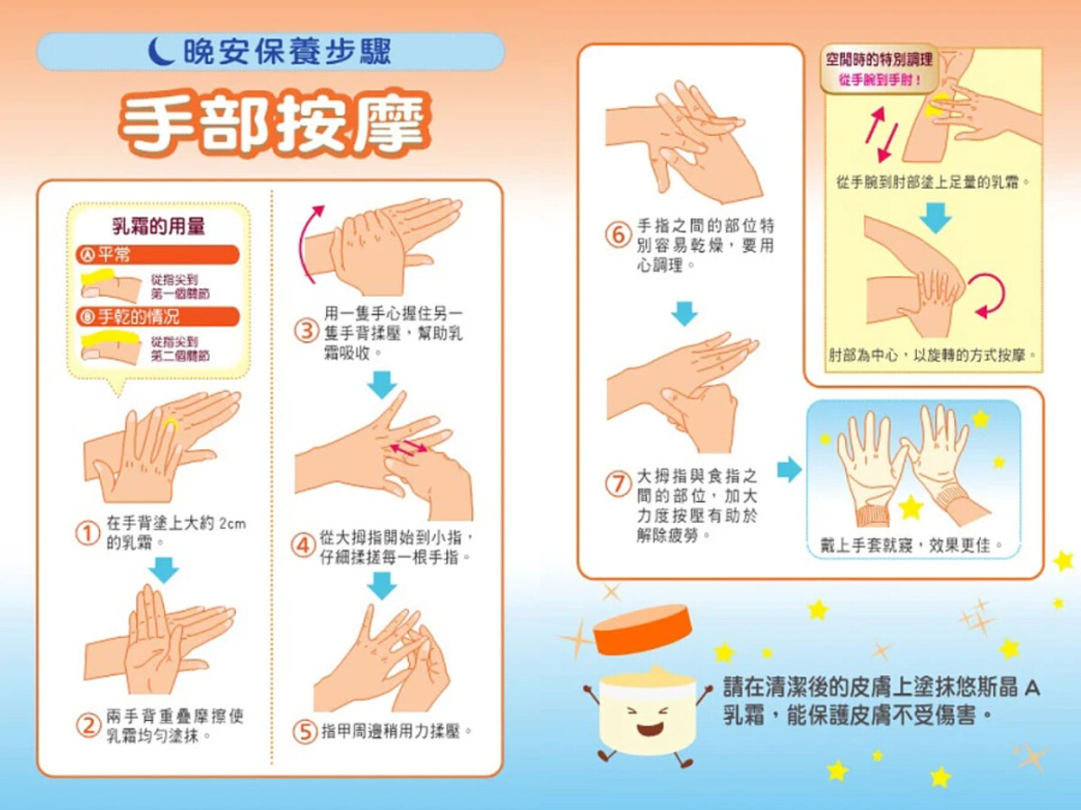 - 用一隻手心握住另一隻手背揉壓,利用掌溫幫助乳霜吸收。