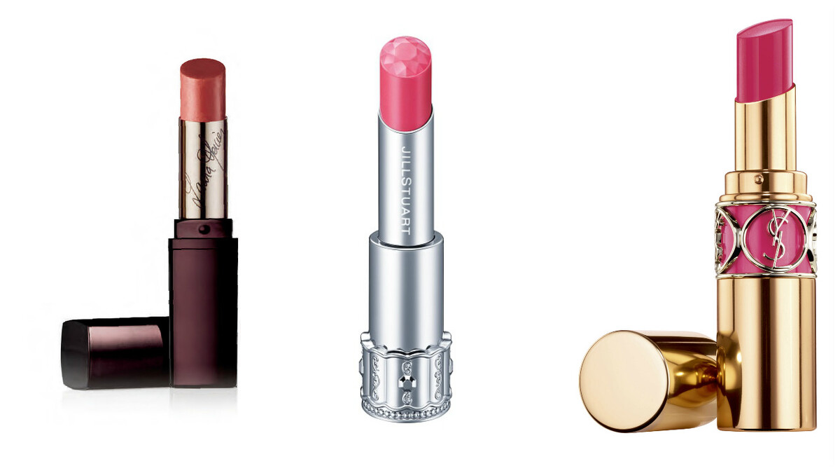來不及豐唇推薦:(左:Laura Mercier蘿拉豐潤漾唇膏,中:Jill Stuart 花舞戀唇膏,右:YSL情挑誘光水唇膏#49桃色玫瑰 )