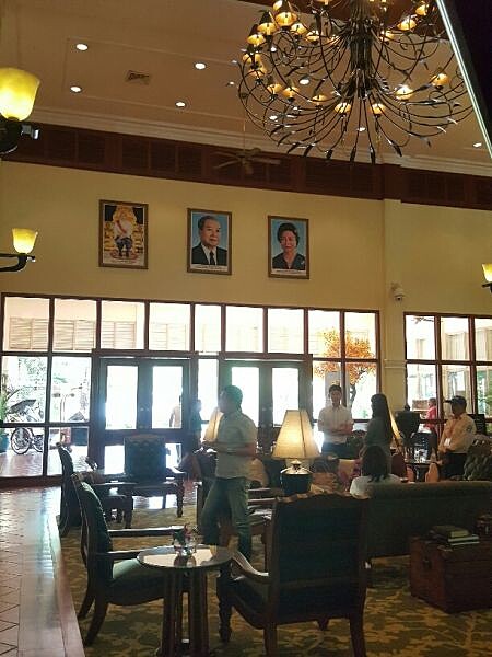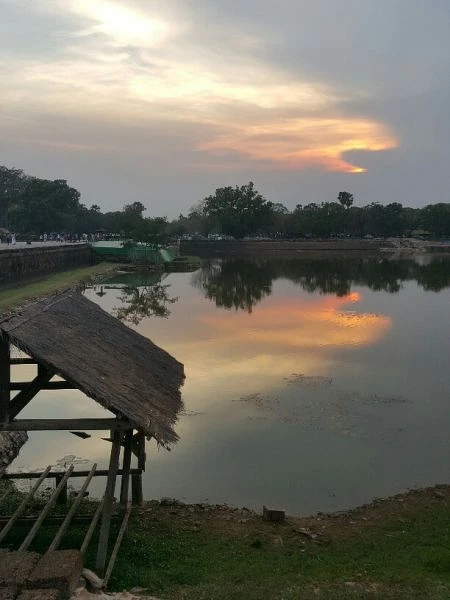 飛機都還沒落地,從高處向下看就是一大片紅土,幾乎是沒看到什麼高樓大廈,多以農田為主。坐上前往飯店的車,也挺有趣,沿途是大樹跟斜射下來的陽光,也錯落了一些賣飲料的小販。隨車導遊一邊說,柬埔寨曾為泰國殖民地,但後來擊敗泰國軍隊,所以才稱為「Siemreap」,暹粒,其實意思類似割除了暹羅。導演開玩笑說,當然泰國人來就是別的說法囉。