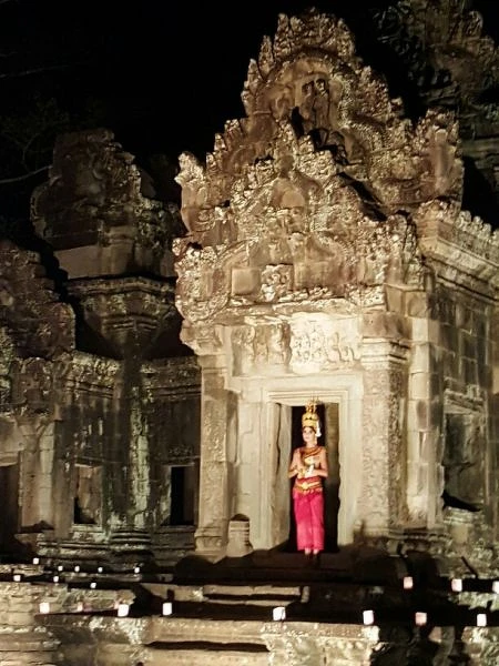不過,時尚圈人士怎麼可能灰頭土臉地爬完去參加記者會呢?克蘭詩隔天還準備了一個在千年寺廟旁的晚宴,我們就坐在戶外,伴隨涼風月光,傳統柬埔寨舞蹈、表演,佐美酒佳肴,度過美好一夜。
