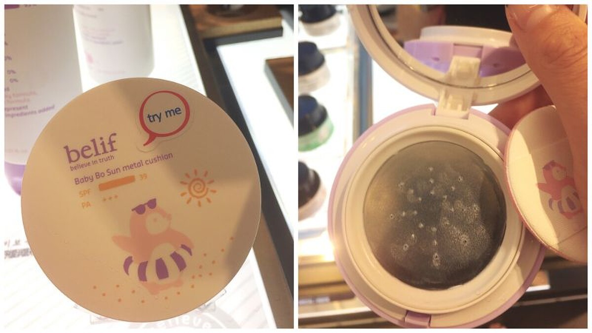 這款防曬氣墊將防曬乳包裝在粉盒中,主要強調方便好攜帶,每按壓一次的出粉量,都是經過精算的有效防曬量,特別將海綿換成不會回滲的金屬墊,也在加強產品的潔淨度,是韓國目前頗流行的小朋友防曬品。