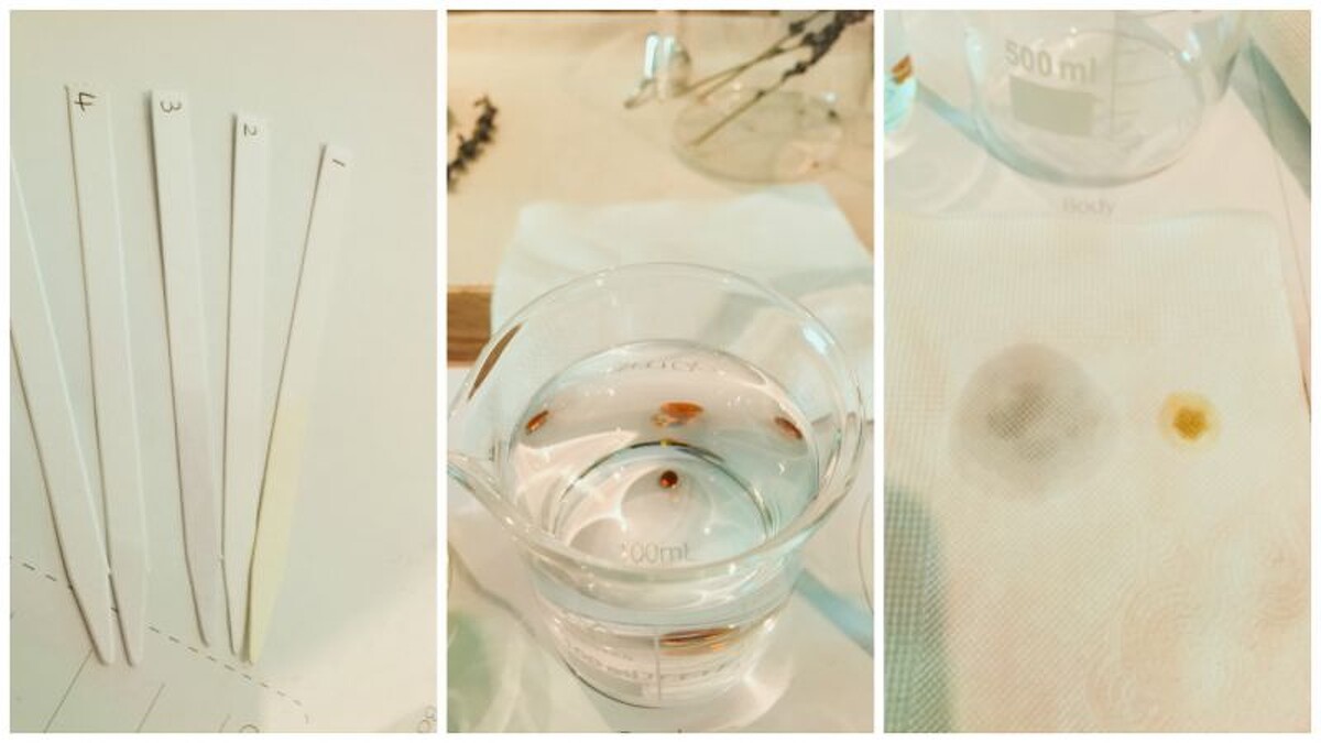 香味測試法:同一種精油,包含了各種不同的化學成份,有的揮發快,有的慢。所以,精油應該會有前、中、後味,雖然味道上有整體性,但不同時間點聞香,會對應不同的香氣。