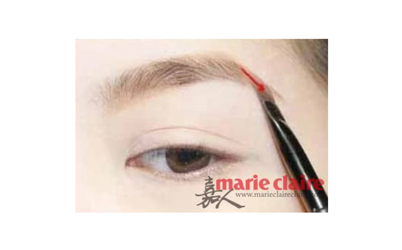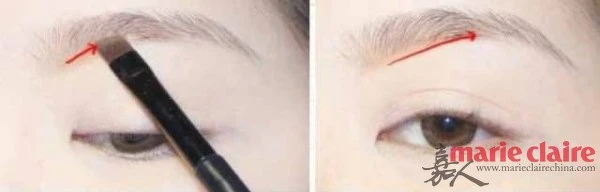 step1:用淺色眉粉填補眉頭下方,斜向上往眉毛中心勾勒,這樣能自然使眉頭下沉,形成彎眉的起點。