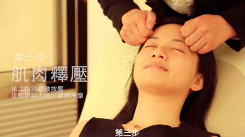 雙手握拳,以指結按壓眼尾到太陽穴的c zone區域,放鬆眼周肌肉。