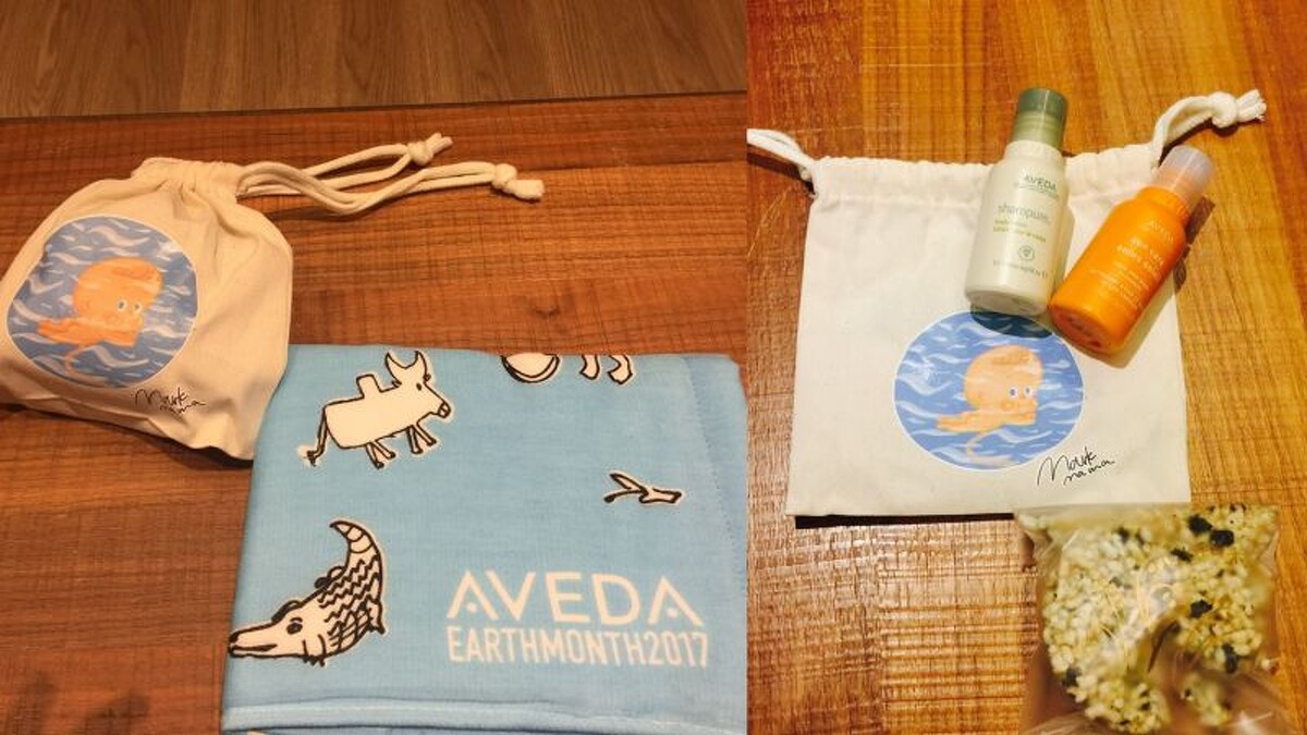 報到時會獲得的一條馬達加斯加兒童手繪毛巾,以及有著馬克媽媽手繪Baby的束口袋(裡面有著 Aveda旅行組容量的美體潤膚乳,以及艷陽活力雙用乳),還有貢寮「水梯田復育計畫」所產的米零食。