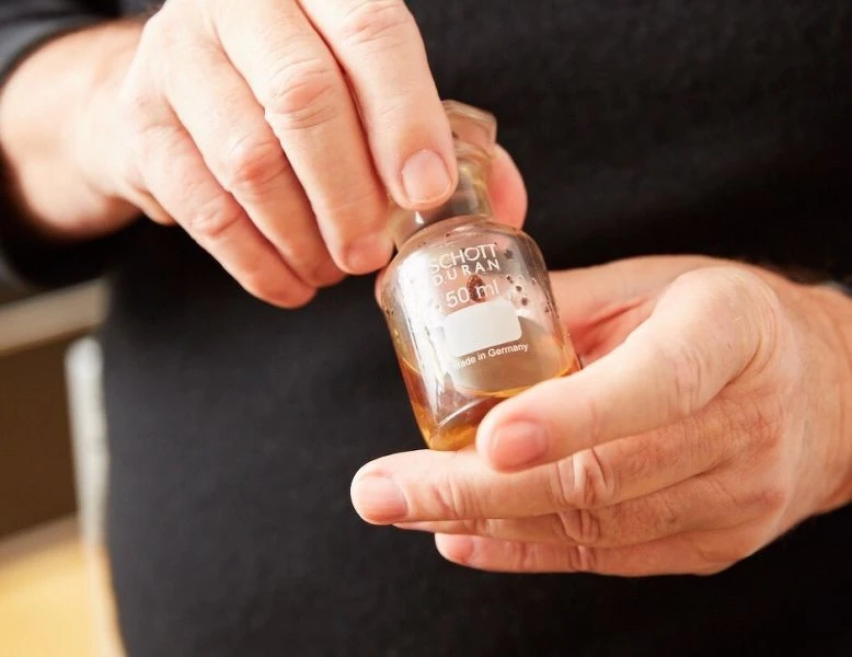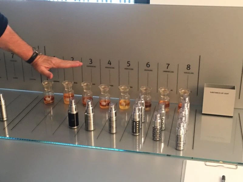 他舉例:「有一次針對全新產品配方,我將兩種不同屬性的生物光子編排在一起,隨著時間發現兩種特性幾乎無法和平共處,兩者互斥,產生一團黑色結構物,」我們看著透明瓶身中濃稠的黃色液體,一團明顯糾結在一起的物體飄浮其中,聞起來還有怪怪的味道;反之其它配方就有著植物發酵的清香,這些將5~10種植物特性,按照特殊比例組合而成的回春核心技術「光子回春能量貨幣」,背後靠的是窮極一生的專業與對植物特徵、成長程序驚人的知識,這種依植物特性搭配的修護工程,也使得Noesa鉑金光萃全產品不含防腐劑、化學乳化劑與任何界面活性劑。