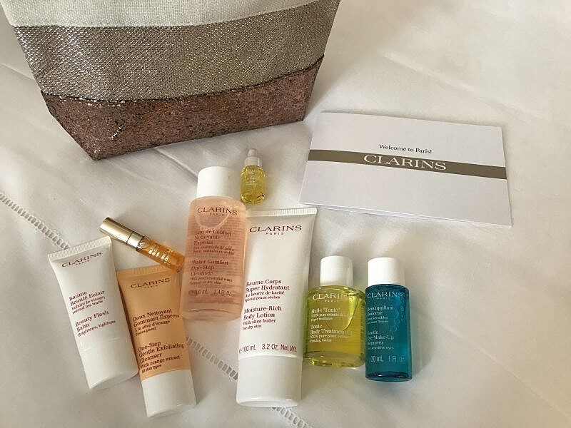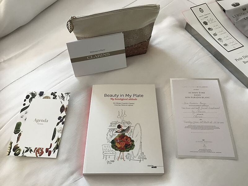 而且床上正躺著這次活動,克蘭詩為所有媒體準備的卡片與小禮物。而且走到浴室,赫然發現原來Royal Monceau一直都是用克蘭詩的洗髮沐浴系列作為備品(蓋章加分)。