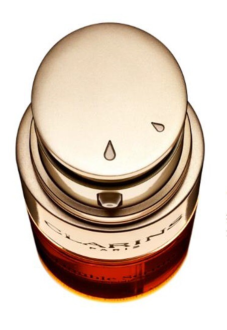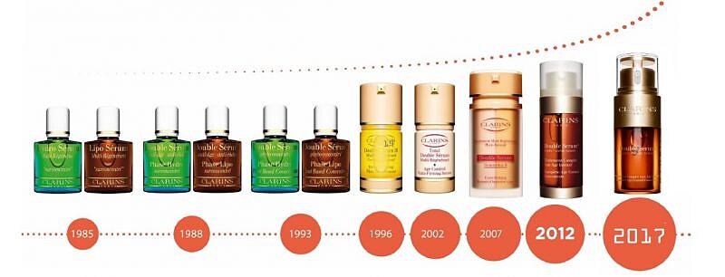 這瓶克蘭詩的保養類王牌,1985年就誕生了,第二代克蘭詩掌門人、同時也是現今董事長的Christian說,當年剛推出時,他有一個小故事:曾經有一個帥氣藍眼的男人,他遇見一個美麗女人,她們在飯店的酒吧碰見,男人就問她要不要一起再去喝一杯? 她說好,這就是黃金雙激萃裡的 「保濕」;男生:那你介意跟我一起晚餐嗎?女人願意,這就是成份裡的「養分」;接著,由於男人生性浪漫,所以他想帶著女人去塞納河畔散步,她說好,於是他牽著女孩的手沿著河岸走,這是第三種功效「含氧」;然後,他單膝跪下,問女孩願意嫁給他嗎?女孩說好!兩人結婚後,決定生子,這是第四種功效「再生」;最後,藍眼男孩有了小孩,他身為爸爸,必須要全力保護孩子,這就是第五種「保護」。
