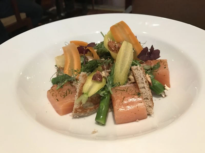 Royal Monceau,據說是克蘭詩先生最喜歡的一間飯店,連餐廳裡都有一道菜,叫做克蘭詩先生沙拉(編吃了!正如下圖,是一道很多鮭魚、紅蘿蔔、櫛瓜、藜麥等食材的沙拉)。