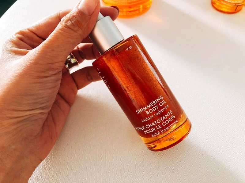最後一款「金光閃閃身體護膚油」是黯沉肌的救星,以摩洛哥堅果油與芝麻油為基底,考量到有這樣需求的人,可能即將穿上隆重禮服、新娘服、比基尼,因此運用專利配方設計出迅速滋潤且吸收的質地,礦物珠光展細非常細緻不浮誇的光澤,彷彿之前費勁心思保養的光澤透明感,淡淡香氣讓人很想靠近。