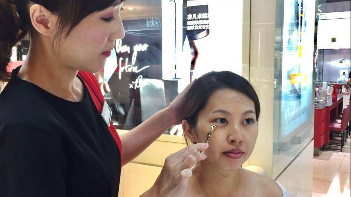 臉部的護膚服務除了美容顧問專業的手法之外,櫃上還有小金棒,來按摩臉部的穴道、眼周,讓整個臉部循環更好。