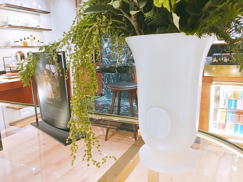 雖然稱之精品店,但diptyque店面並不會讓人覺得有距離感,反而有種像是走進設計師家中的感覺,處處值得玩味。由於diptyque強調在各國都能融入在地元素,因此這間店大量使用台灣素材,例如來自花東的大理石、檜木等,與diptyque招牌的黃銅材質搭配得非常和諧。