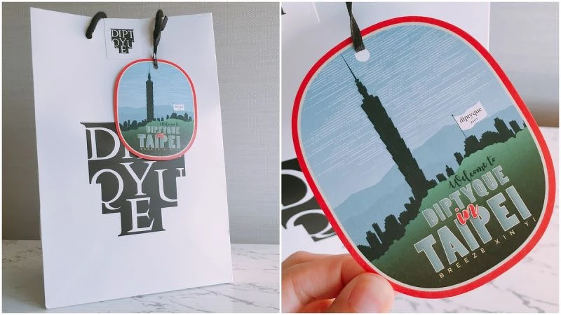 diptyque許多香水都是來自創辦人旅行時的回憶,因此boutique開幕時提供的媒體資料袋上出現了一個很特別的紙卡,外型就像是行李箱吊牌,上頭還出現了101大樓的圖案,非常特別。