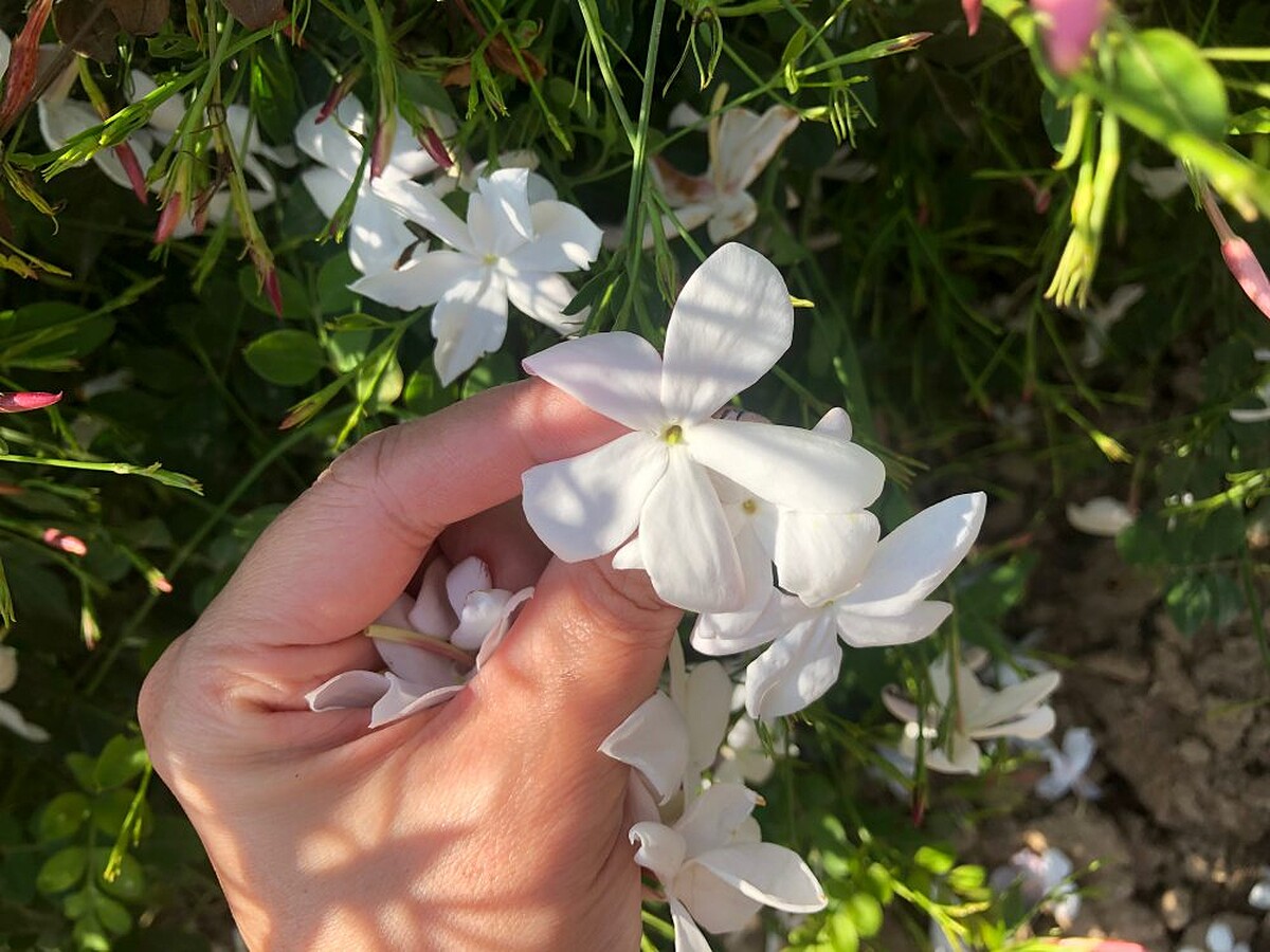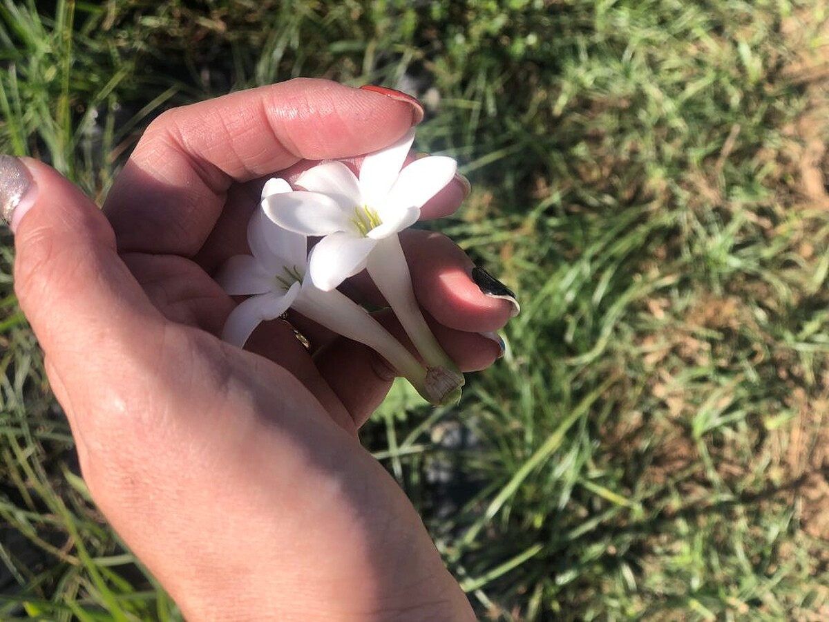 你摸摸看這個茉莉,非常柔軟滑嫩,握在手中風一吹就會飄落,這是大花茉莉,跟一般人認知的茉莉不太一樣,他的香氣很甜美明亮,充滿多汁的水氣,輕靈曼妙,鮮嫩脆弱,雖然很容易摘取,但摘取的過程仍需要小心翼翼。