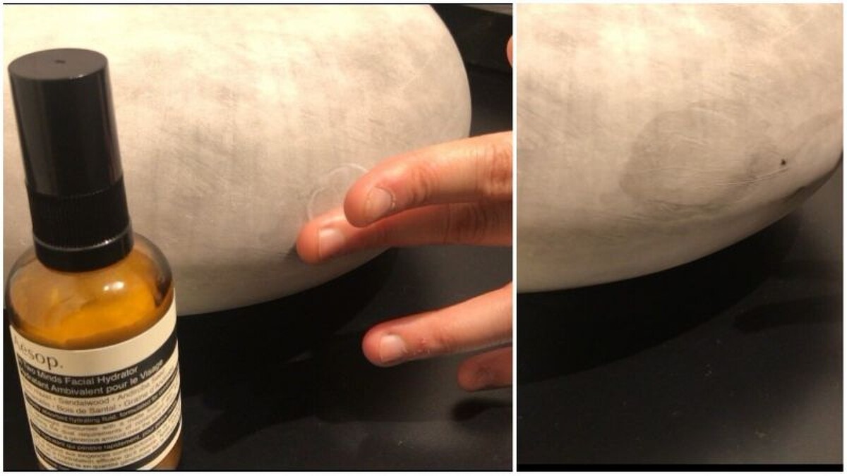 蘇珊.桑托斯更親示範將「二重奏保濕精華乳」塗抹在陳列的瓷石上,透過石器紋理更容易看出其油質比重,的確符合了產品必需「輕盈無負擔」的要求。