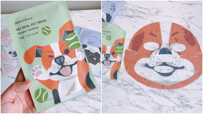 innisfree 將於2018年4月15日推出「我的汪汪面膜」,共有哈士奇、臘腸、吉娃娃、巴哥、米格魯5款,一拆開包裝就能看到有可愛狗狗圖案的面膜紙。這次innisfree特別使用美容專用色素,所以敷面膜時不用擔心印到臉上的問題。