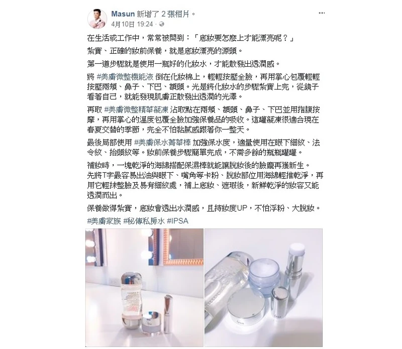 為肌膚補充水分後,最重要的是將水分留住。尤其是進入春夏之際,可改用精華凝凍代替乳液,讓肌膚補充營養時不增添過多油分負擔。IPSA的美膚微整精華凝凍一直是化妝師、網友們熱推商品,無酒精色素香精成分不擔心過敏,清爽質地一擦還能使肌膚有微微緊緻涼感,非常適合夏季使用。化妝師MASUN同樣也在個人facebook表示上妝前他會「沾取點在兩頰、額頭、鼻子、下巴並用指腹按摩,再用掌心的溫度包覆全臉加強吸收。」打造紮實的水潤感讓持妝度UP。