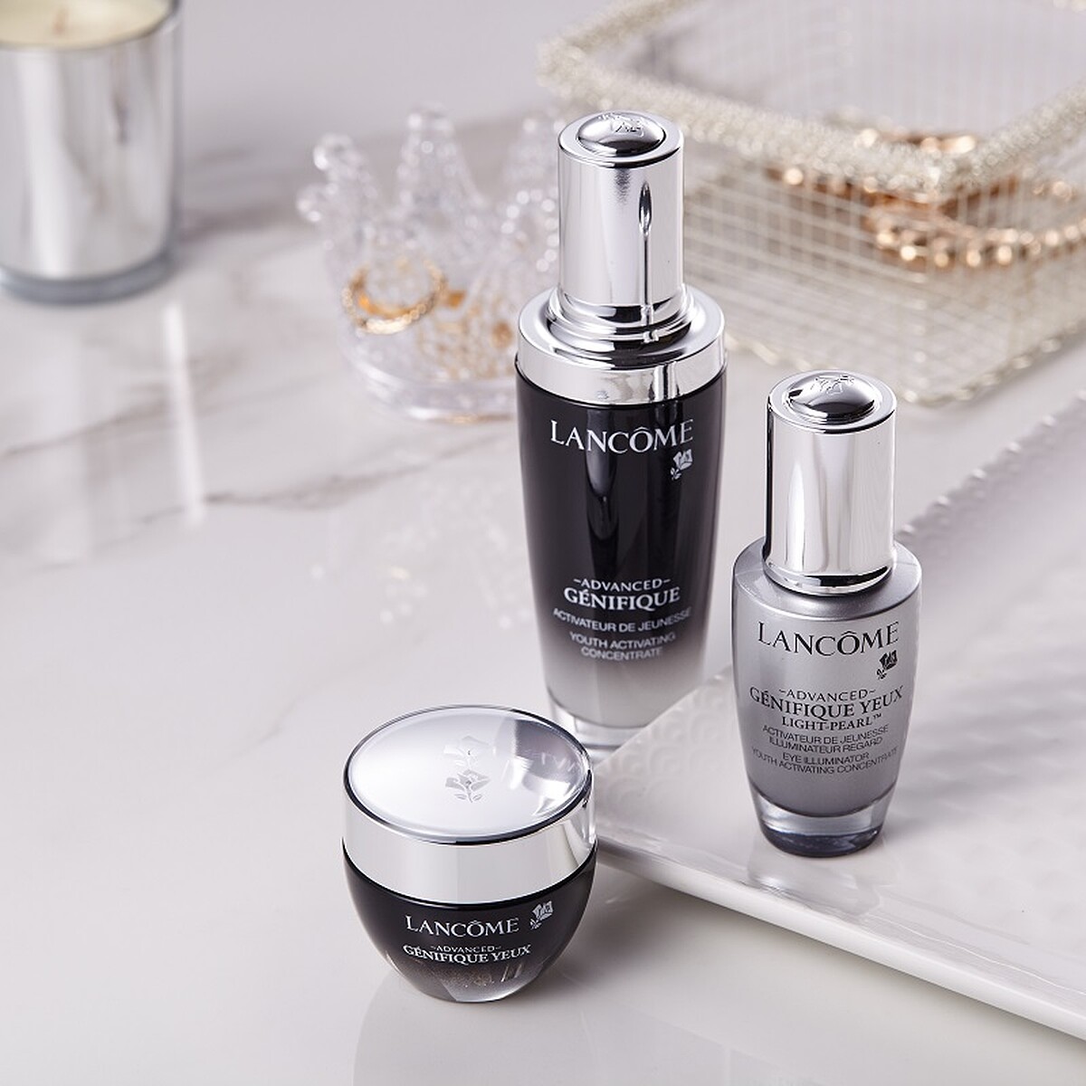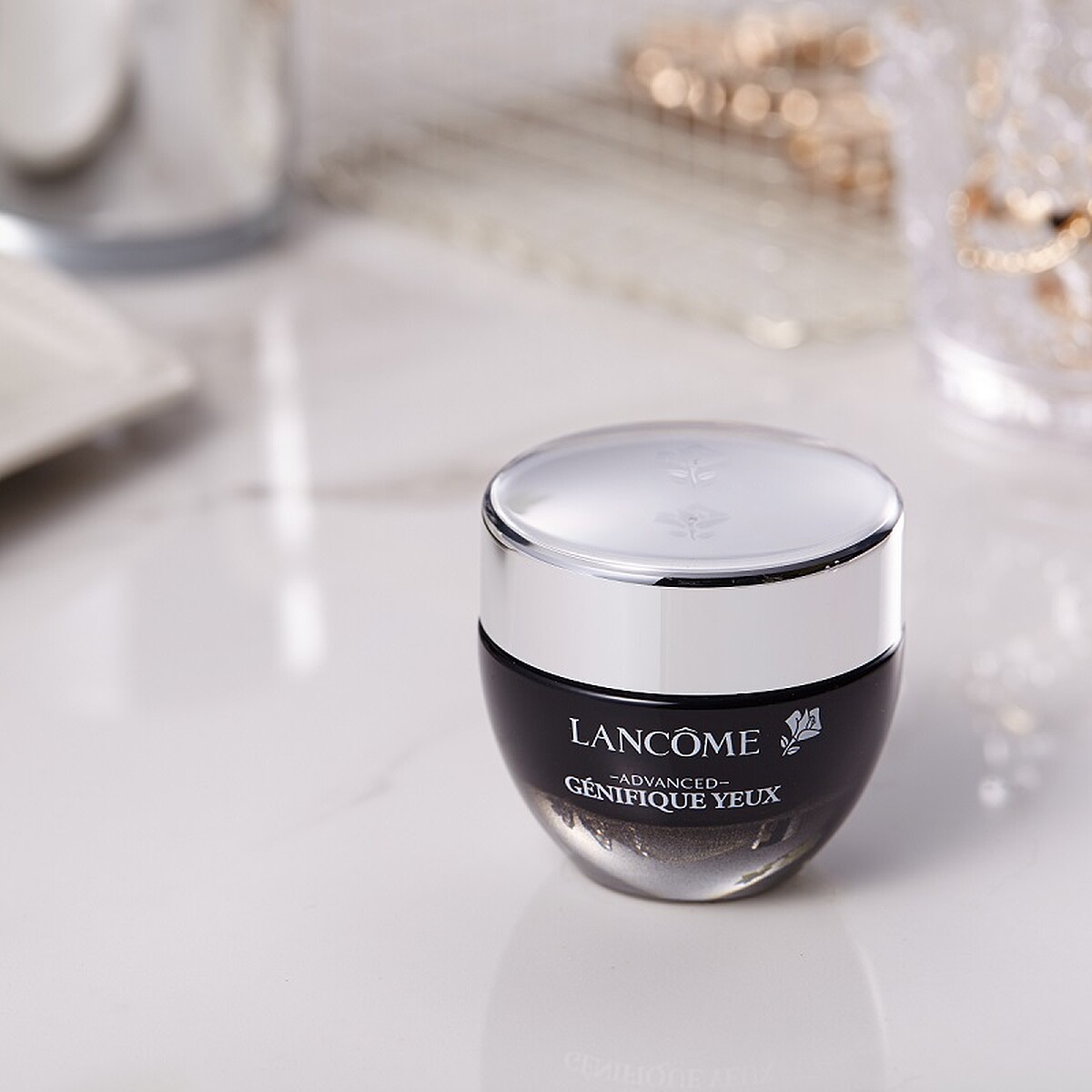 像周冬雨一樣「熬夜永遠睡不飽」、「低頭用眼過度」的手機世代,最怕視覺上看起來老了 5 歲…為了解決用眼過度、睡眠不足、藍光侵害對眼周肌膚帶來的細紋與暗沉,蘭蔻以自家最經典、暢銷的小黑瓶為基底,打造全新「超進化肌因亮眼精粹霜」,富含3重活性修護精華,舒芙蕾般的綿密輕盈質地,一抹眼周柔滑明亮,加上精粹凝霜中添加細緻珍珠微粒,就像幫眼周開啟美肌光圈,喚醒眼睛新年輕。