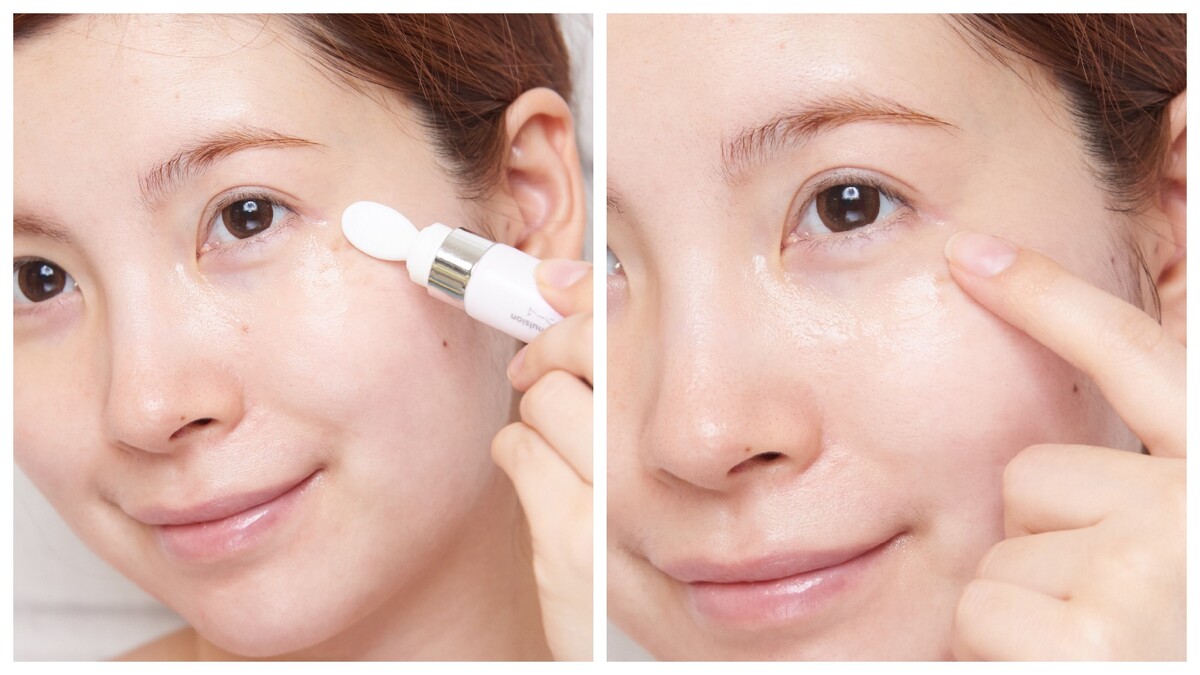 細緻凝乳質地,特別添加光果甘草萃取,搭配冰涼陶瓷按摩筆,可幫助精華液吸收,再加上簡單的拉提按摩,讓眼周保水緊緻,看起來更有精神。