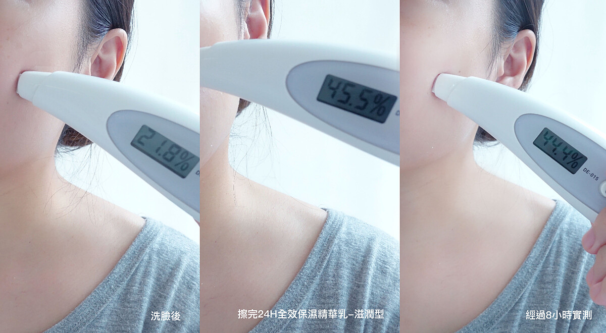 還有什麼比使用後保濕度飆升還更威!?冷氣房裡經過8小時(早上8點~下午4點)後實測保濕度依然不減,讓M編滿意到拍手手!全效活泉保濕威能果然真心不騙,肌膚根本變成一座天然儲水庫,保濕儀上的數字讓人心花怒放笑出來!