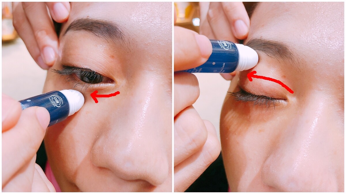 使用矢車菊亮眼滾珠凝露分別從眼頭輕滑至眼尾,約3~5下,眼頭、下眼皮中央因為有穴道,也可稍微輕壓,以涼感第一步先冰鎮雙眼。