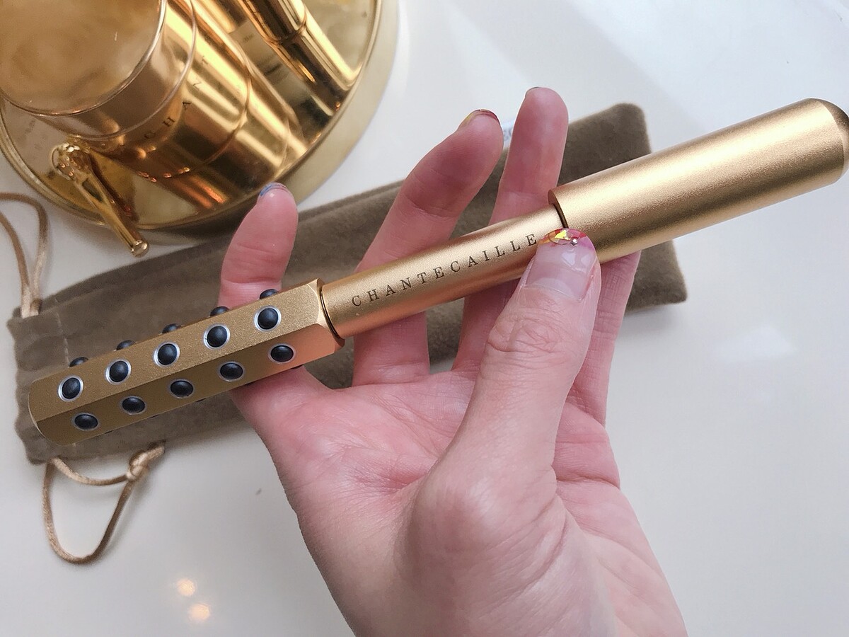為了讓珍稀的成份更有效率的作用,可以搭配限量送出的「極緻純金賦活滾輪」使用。使用前先將「極緻純金賦活面膜」刷勻整臉,再利用滾輪鑲有鍺石的那頭,由內而外往頰際輕輕滑動,大概滾滑約3~5分鐘即可,能讓肌膚展現亮麗光采。