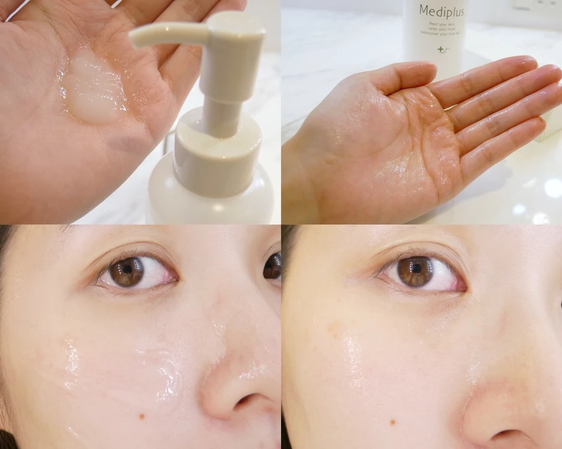 Mediplus美樂思凝露是按壓式的瓶身,原則上一天的用量約是擠壓三下,早上起床上妝前當作可以當作妝前保濕按壓一下,搭配晚上臉部清潔後按壓兩下,使用一樣先在掌心搓開,會發現變成較為水感的質地,輕輕的由下往上均勻的按摩臉部肌膚,這款凝露的吸收速度很快不會產生夏日最害怕的黏膩感,補足水分後,瞬間肌膚摸起來就又恢復Q彈Q彈的。