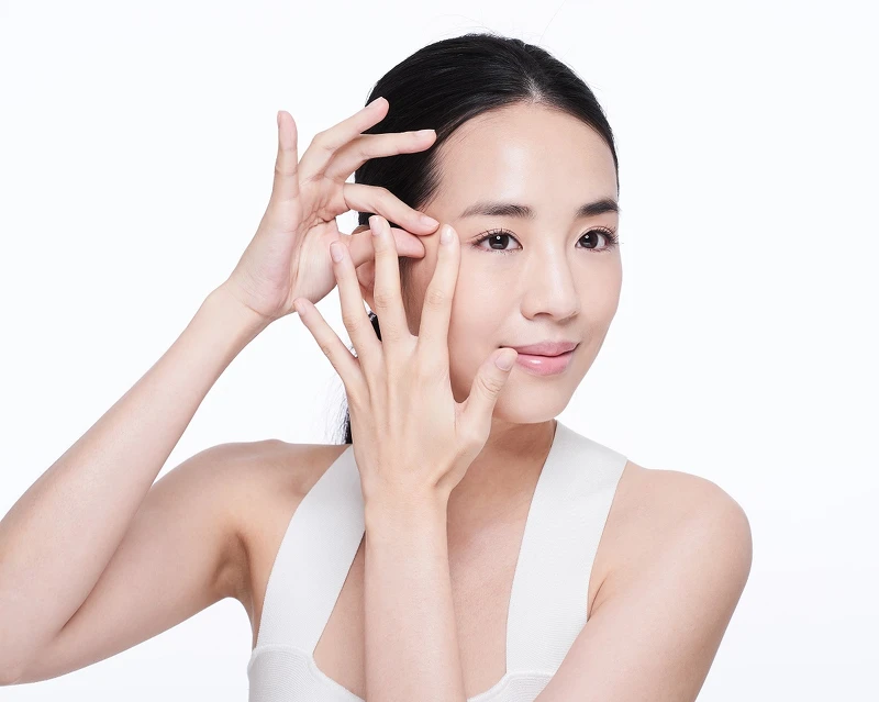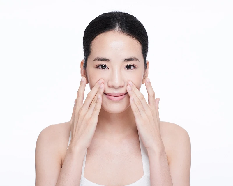 第一步:輕輕捏左右下顎、並順勢向上輕捏雙頰,重複三次。這個動作可以促進肌膚內部膠原增生喔。