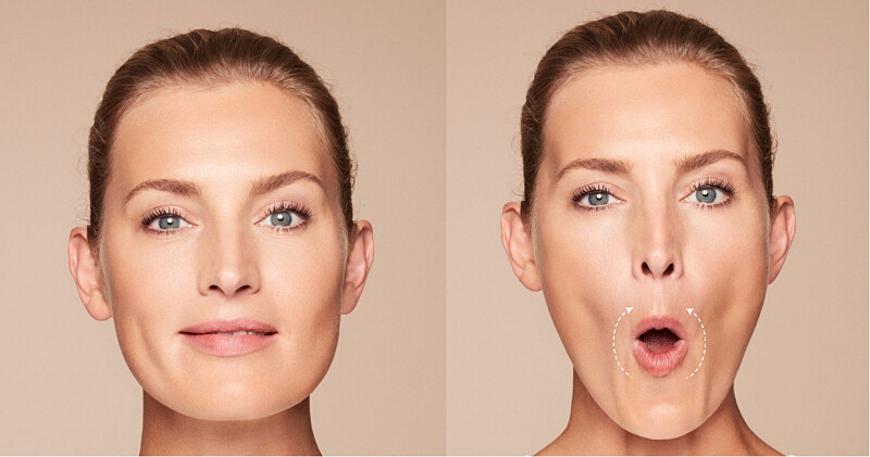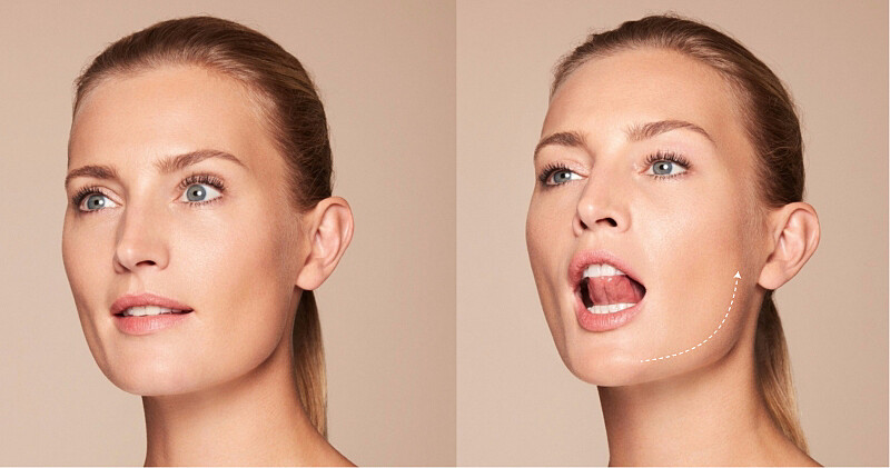張開嘴巴並盡可能展開最大的微笑,讓嘴角與蘋果肌向上拉提