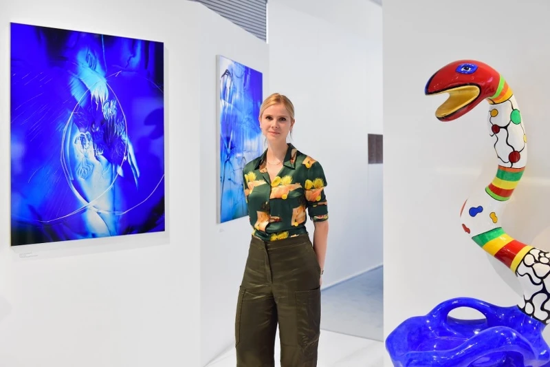 (上圖) Manon於瑞士巴塞爾藝術展與「鏡子」、「窗景一瞥」及Niki的雕塑「藍蛇」,進行跨時空的藝術對話