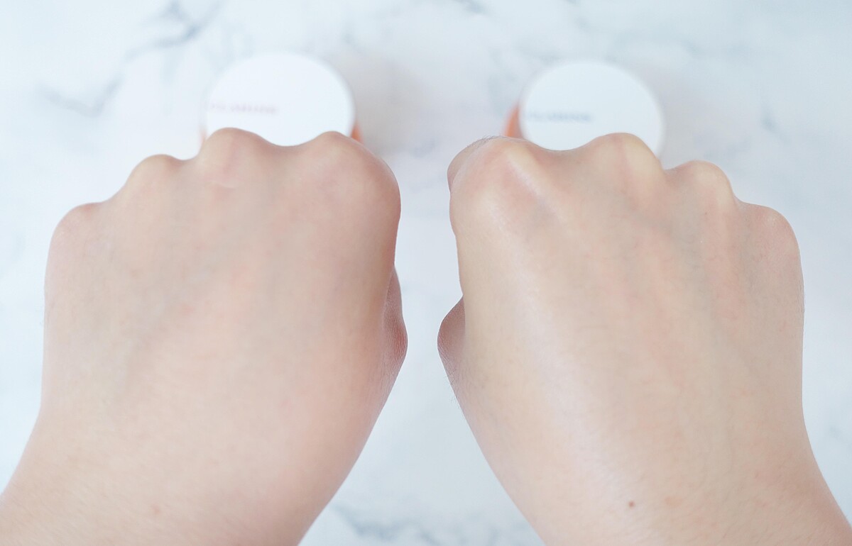 「煥顏緊緻彈力日晚霜」鮭魚粉色絲絨乳霜質地,輕輕推開即被肌膚吸受,飽滿的潤澤感,卻完全一點都不黏膩,一般膚質都能使用。「煥顏緊緻彈力潤澤日晚霜」則推薦給乾肌。