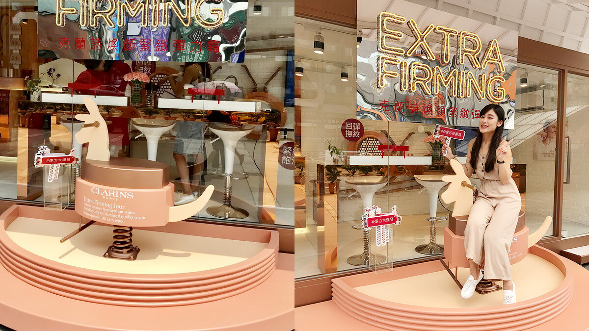 小時候一定玩過這個搖搖馬吧!這個底部連接的強力彈簧就是比擬肌底撐起肌膚年輕容光的滿滿彈力(宮廷劇口氣)!而且這可是連大人都能坐的搖搖馬喔~第一步就是快拿起CLARINS克蘭詩貼心準備的拍照標語,坐上去拍個仙女照先。