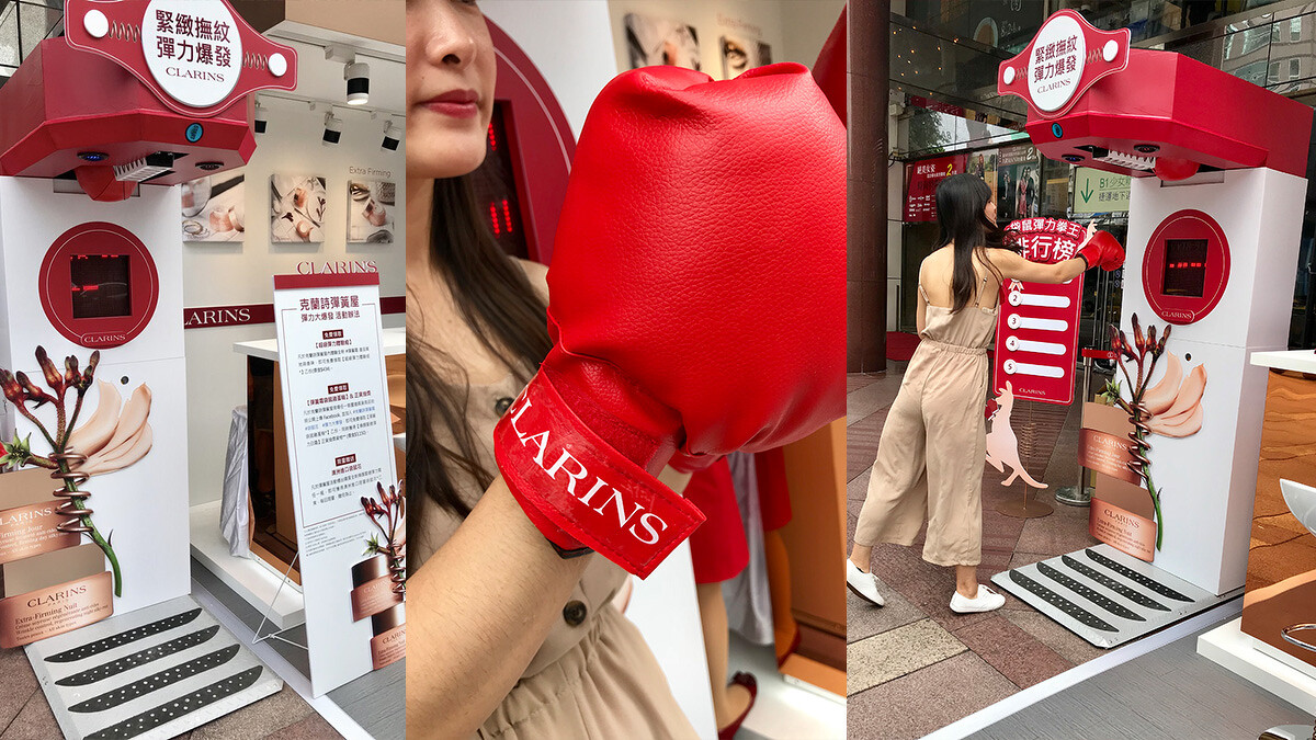 面對臉上的鬆弛、老化現象真的是不想忍?來吧~面對袋鼠拳擊機一舉擊出妳的怒氣,不管是以前的抗老保養不見效、還是最近的煩憂高壓,通通一舉擊倒、不要留情,CLARINS克蘭詩彈簧霜挺妳!對了,記得先戴上紅色拳擊手套跟拳擊機合拍一波,拍起來真的好有FU。