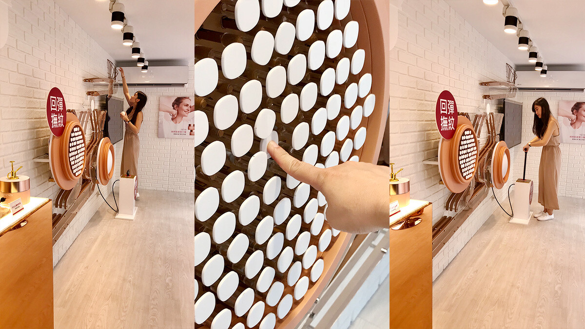 彈簧屋內就打造了一個比擬這個原理的有趣遊戲設置:只要把球從上方籃框放入,球就會進入緊實、彈力的青春儲藏室內,現場鬆弛的橡皮球面、下凹按鈕代表肌膚失去緊緻彈力的狀態!替球面打氣或讓按鈕回彈代表彈簧霜替肌底注入滿滿彈力,球就能順利通過替年輕加分!