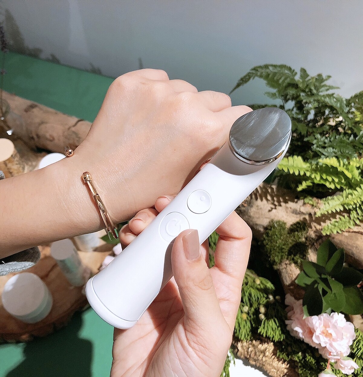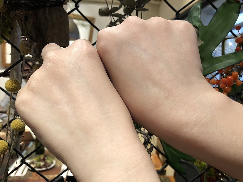 實際測試精華液與美容儀的是使用效果(上圖左為使用後,上圖右為未使用),手上的紋路明顯更為平滑。
