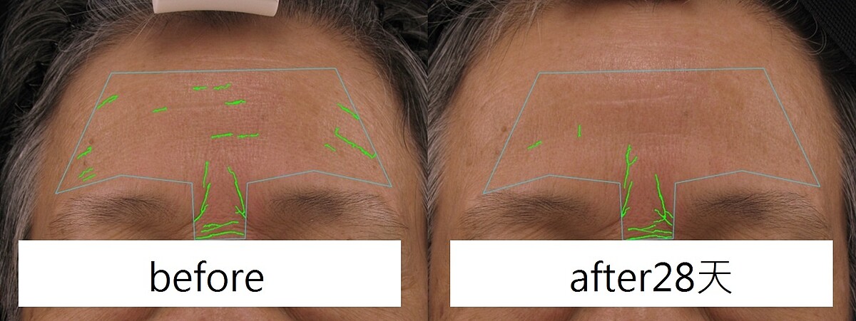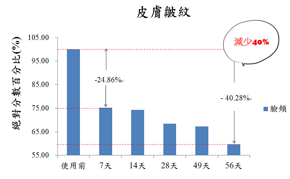 讓M編跟大家分享一下專業的數據,根據受測者皮膚皺紋結果使用7天、14天、28天、49天及56天後受測者的前額皮膚皺紋百分比,臉頰皮膚皺紋百分比大大的降低了40%,真的很驚人耶!
