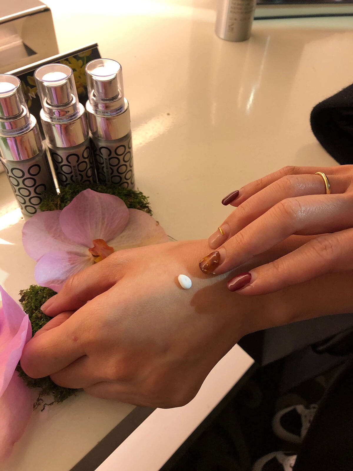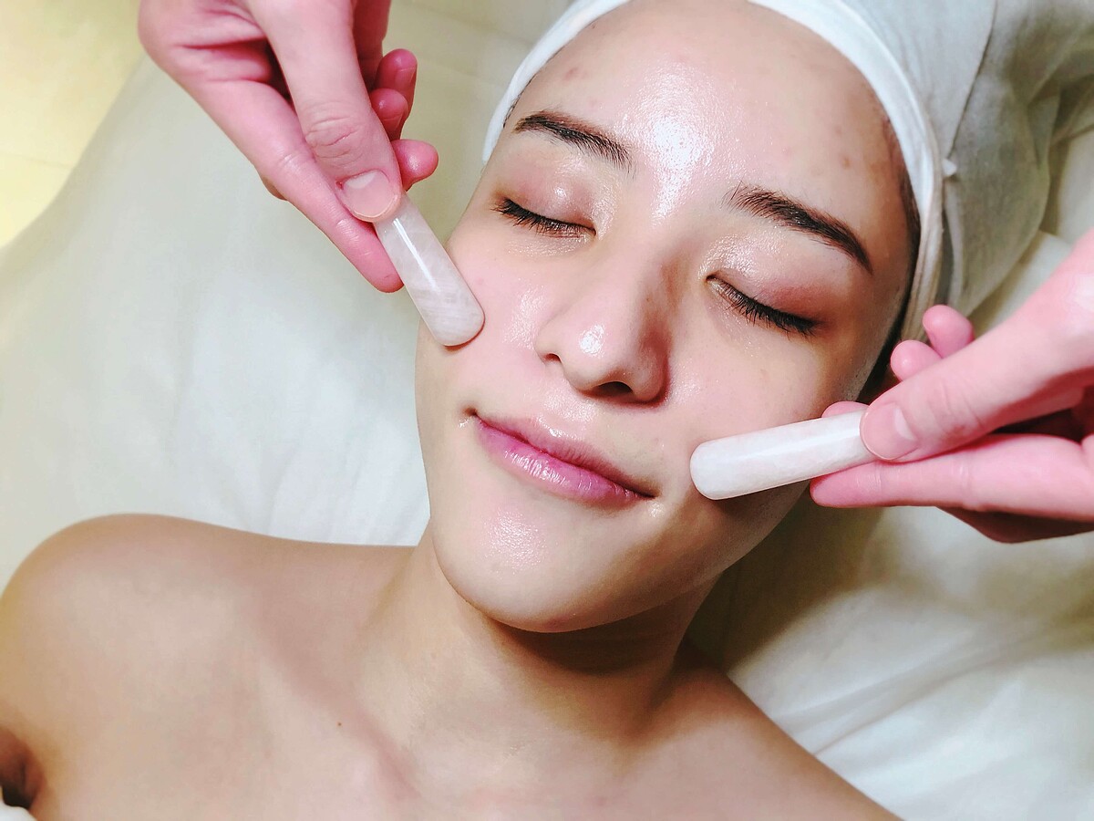接著再以黑玫瑰彈潤水凝霜(曾獲得美麗佳人2018國際美妝大獎)結合全新的玫瑰石英石按摩,特別針對前額、眼周、法令紋做滑動與穴點按壓;結合手部順著肌理拉、提、滑的按摩手法,肌膚吸收滿滿能量,此時以全身酥軟,90分鐘6000元的價格瞬間有一種回本的感覺,最後再以玫瑰精油煥醒深層休息的狀態,肌膚散發著優越感的光芒。