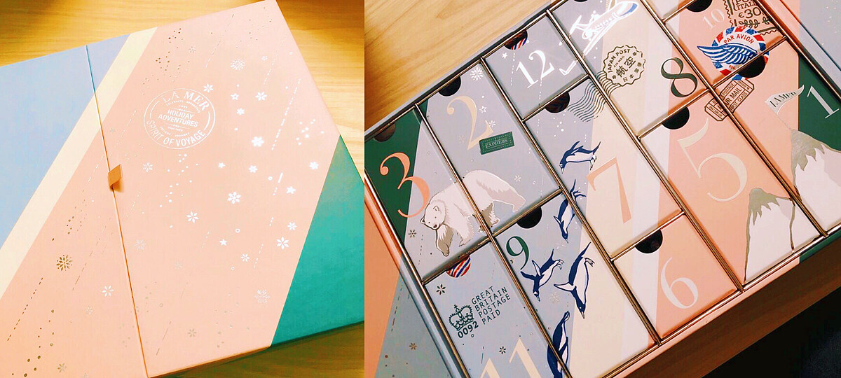 最後的壓軸就是「歡慶限量倒數月曆」!這真的大大滿足海洋拉娜鐵粉。從外觀起就好粉嫩,甚至還蓋有封蠟章的裝飾,非常精緻。打開來更能明白這次的「奇幻旅程」主題,畫著飛機、郵戳、冰山、企鵝、北極熊的圖案好可愛,就像跟著去了這些地方一樣,最棒的是還有海洋拉娜的陪伴,悠遊各國來場肌膚蛻變的重生之旅。