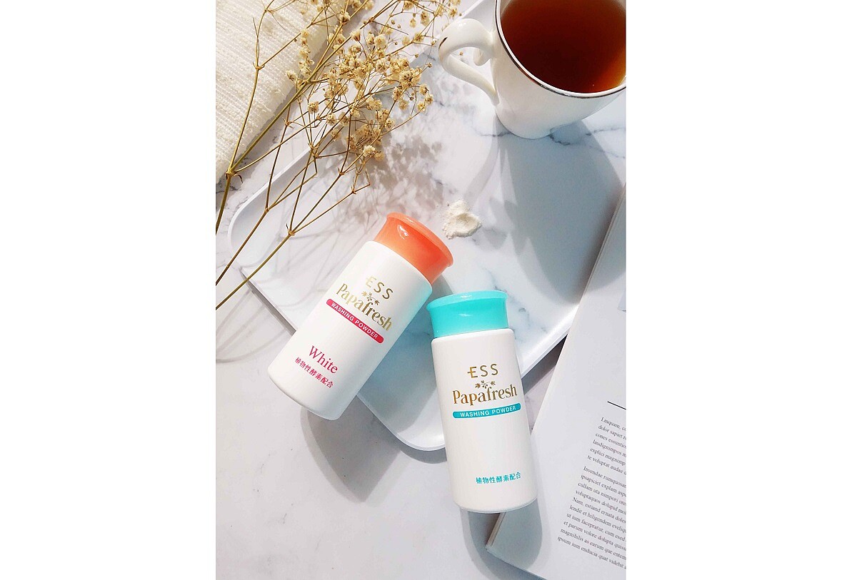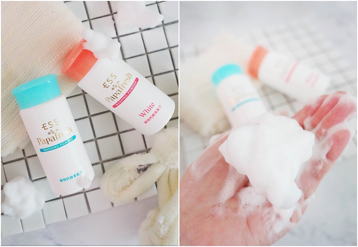 Papafresh微酵潔膚粉,分經典型(藍色)跟透白型(粉紅色)兩款,主要成份為木瓜蛋白酶,蛋白水解力極佳,深層清除肌膚老廢角質、皮脂污垢;桑白皮清潔毛孔;角鯊烷鎖水保濕、抑油,只上淡妝還能直接洗一洗,不必擔心洗不乾淨殘妝問題。