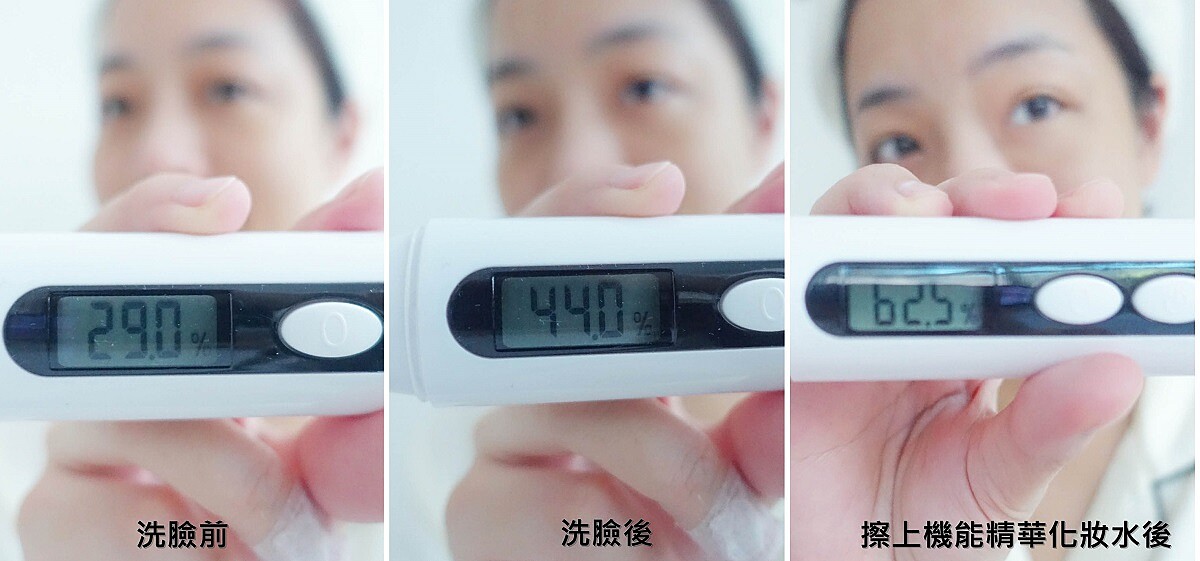 洗臉完用保濕儀器實測,保濕度不但不減,竟然還比洗臉前飆升兩倍,光保濕度這關就達五星等級,接著擦完機能精華化妝水後,看看保濕儀飆高的數字讓M編Hen滿意,養成彈潤飽水的「水煮蛋肌兩步驟」就是酵素洗臉+機能精華化妝水!