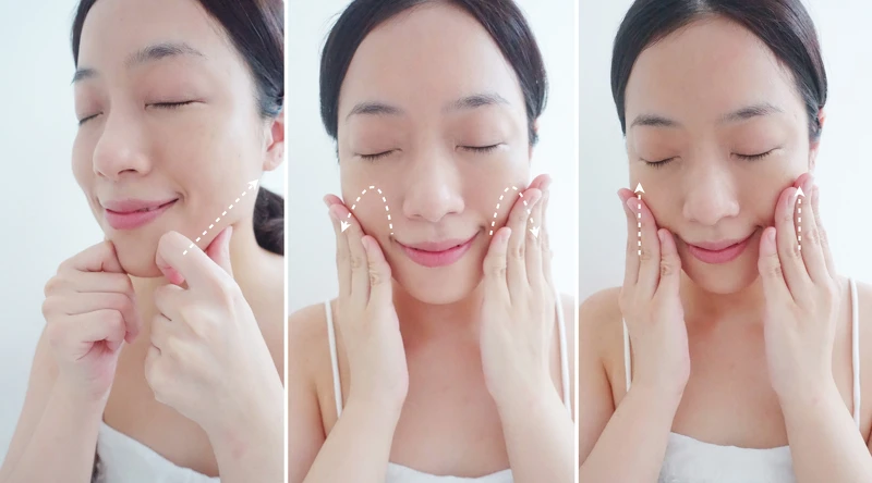 STEP 1:食指和中指沿著臉部線條,從下巴往耳朵下方拉提3次。