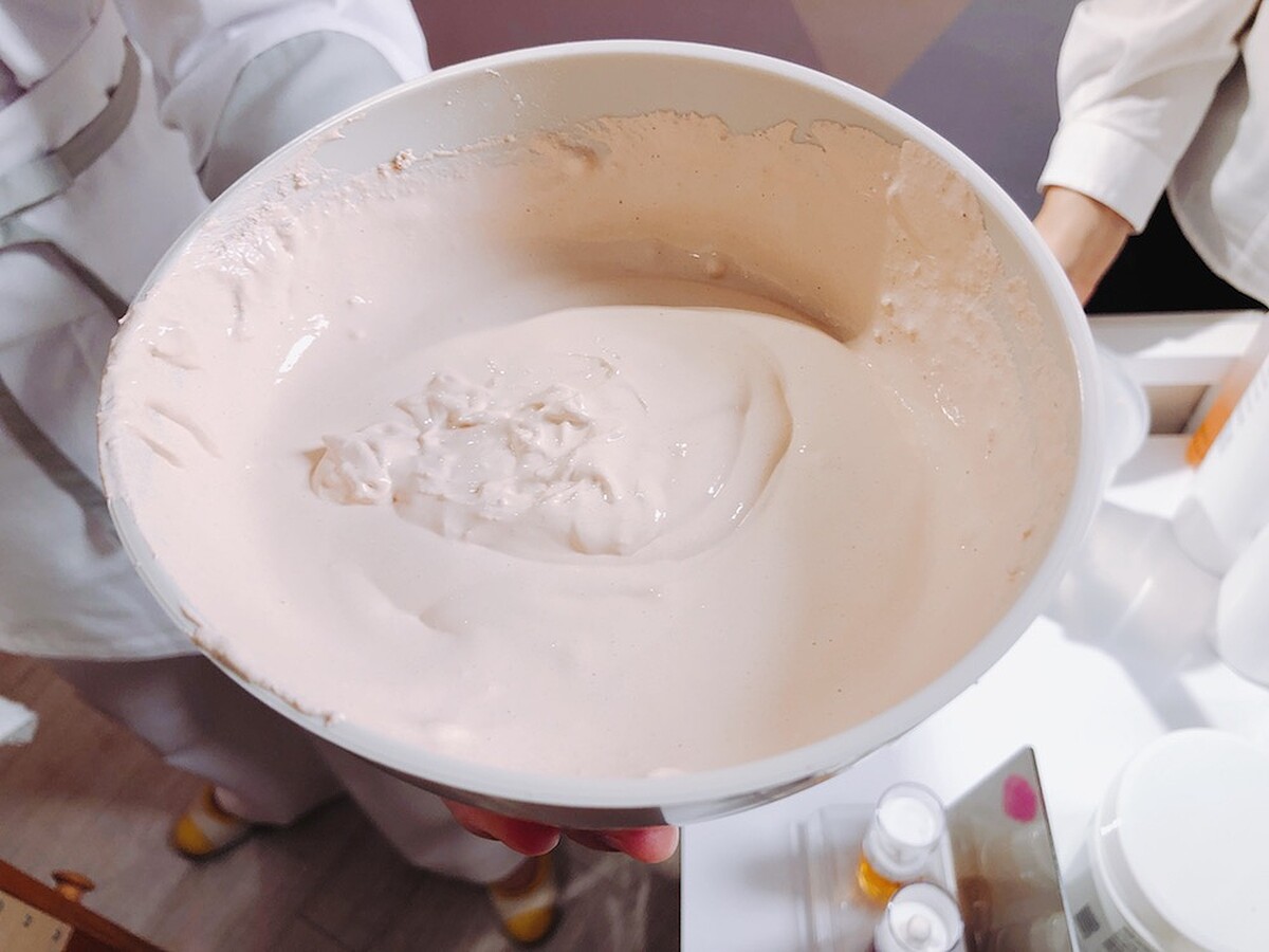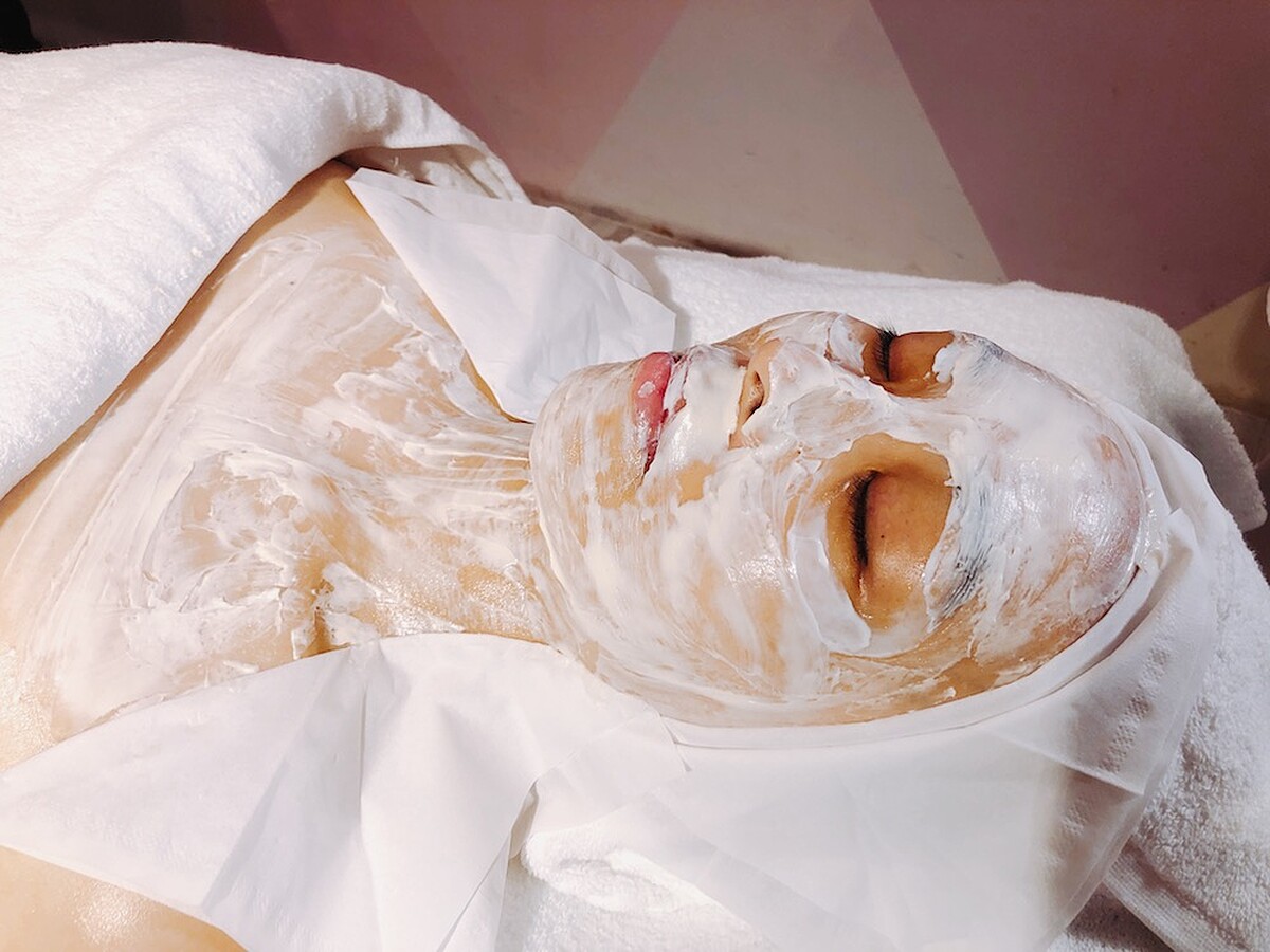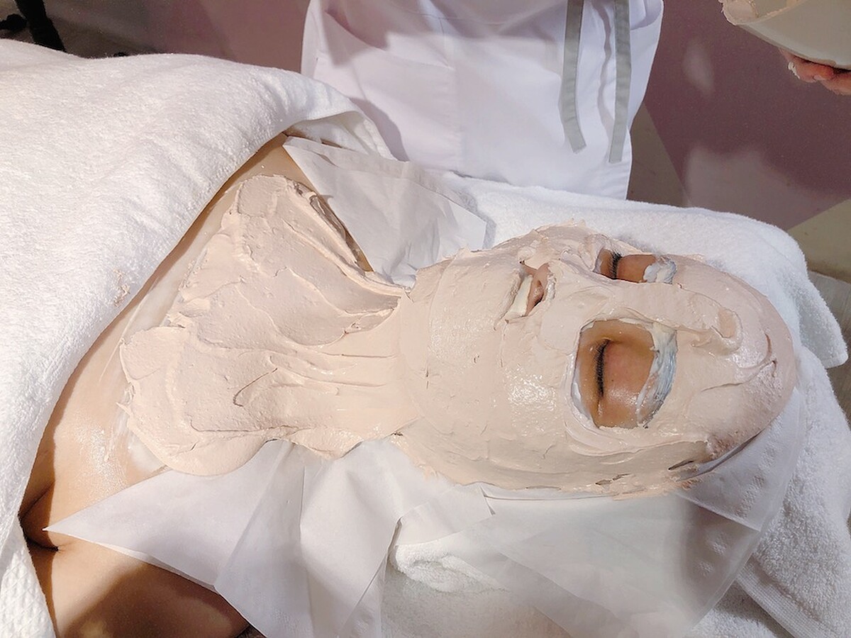 3.塑型熱膜:使用天然的礦物質粉末和水混合,組成了粉色熱膜粉,塗抹在肌膚上再搭配滑膜手法,從胸口到全臉一路拉提,達到「瞬間壓縮護理作用」,讓雙頰呈現緊緻V臉。