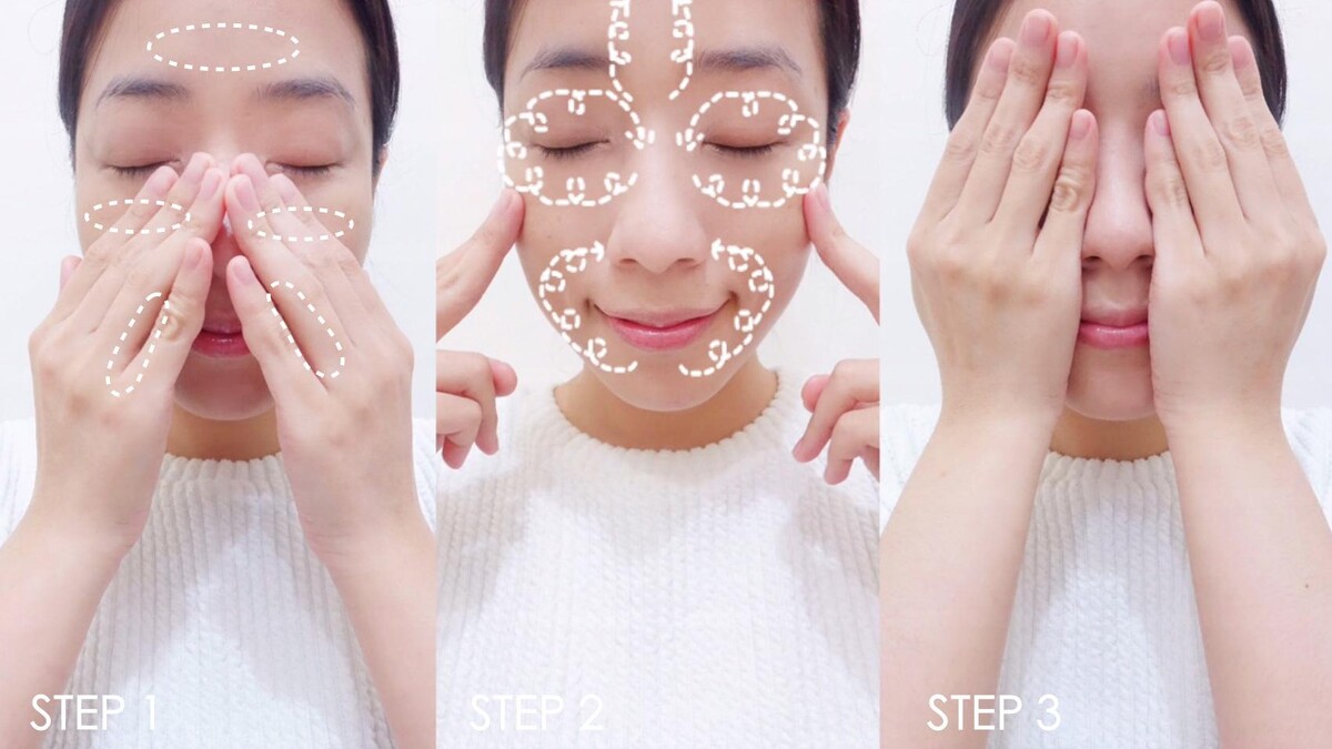 STEP1:雪御活顏水在掌心聞香,用指腹均勻按壓嘴角~臉頰~眼周處。
