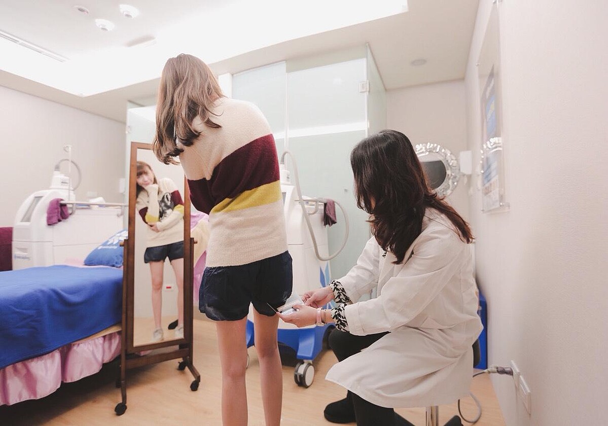 療程不會留下淤青、紅腫,但是醫師會拿類似彩色麥克筆在肌膚上定位治療區域!除了筆跡之外,身體確實沒留下任何蛛絲馬跡,像我做完大腿部位,還是可以穿及膝短裙和褲子出門去逛街,絕對不會有人發現啊!